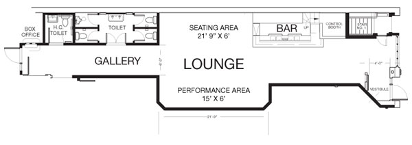 - Floor space dimensions: 21′-9″ x 6′ plus seating and standing room at the bar
